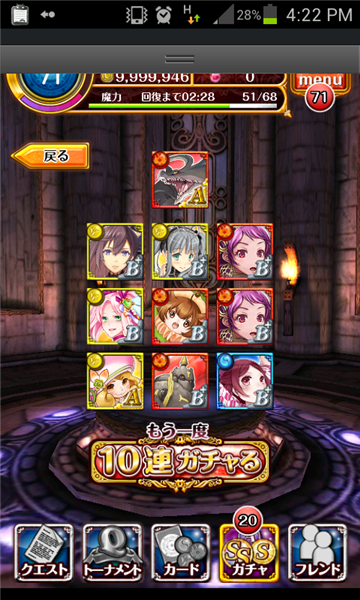 10連ガチャの勇者 黒猫ウィズ73スレ 学園キャラ出現率3倍 2013年09月25日 カテゴリ:話題・グッズ等 50: 名無しさん@お腹いっぱい。:2013/09/23(月) 16:49:58.35 ID:rHZ1oYtK まだ始めて1週間たたんくらいで、50個石貯まったからひいてみたんだが、どう?