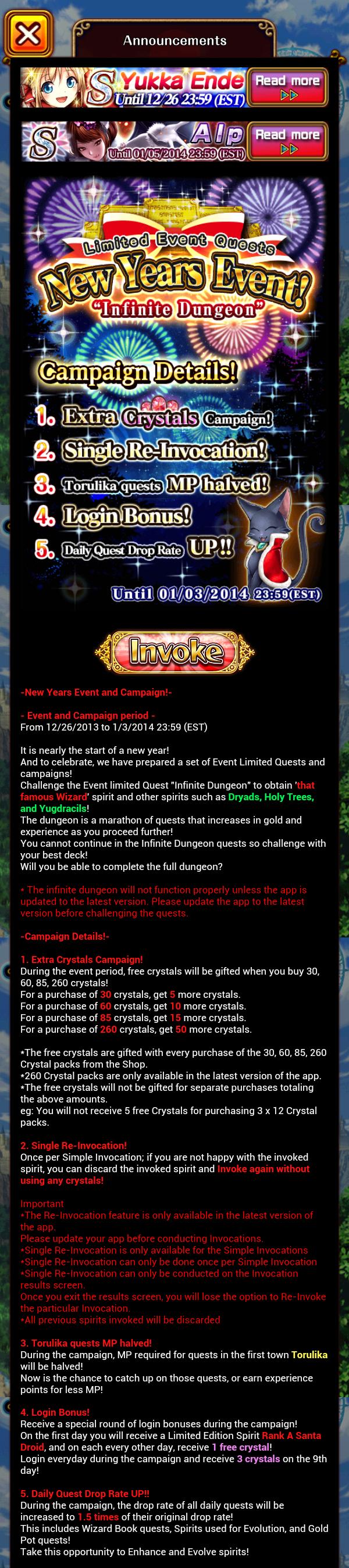 【ウィズ】英語版の新年イベント 無限回廊登場!?単発ガチャも引き直し可能に 2013年12月28日 カテゴリ:海外版 677: 海外版ウォッチャー:2013/12/27(金) 23:06:53.87 ID:CPQtsC/f 盛り上がってるところ悪いけど、英語版の新年イベントもキテるで。 ・無限回廊登場 「限定クエストにチャレンジして、"あの有名魔導士"のカードを手に入れよう!伐採あり。コンテ不可」 有名魔導士…猫ウィズですかね? ・単発ガチャも引き直し可能に