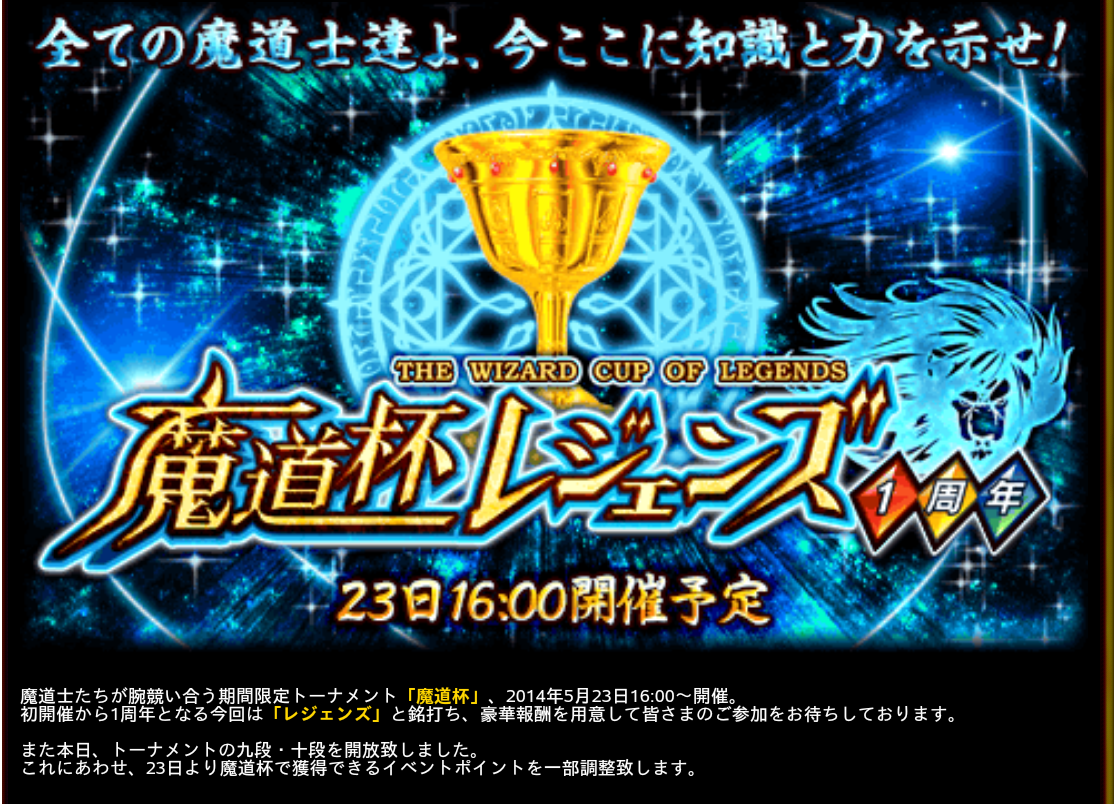 【速報】今日から9、10段解放!23日から魔道杯レジェンド!!!&サーシャ修正キター 2014年05月22日 カテゴリ:話題・グッズ等 535: 名無しさん@お腹いっぱい。 2014/05/22(木) 16:00:42.02 ID:3W0+z63E魔道杯23日からクル━━━━(Д゚(○=(゚∀゚)=○)Д゚)━━━━━!!! 9段10段開放・・・だと・・・