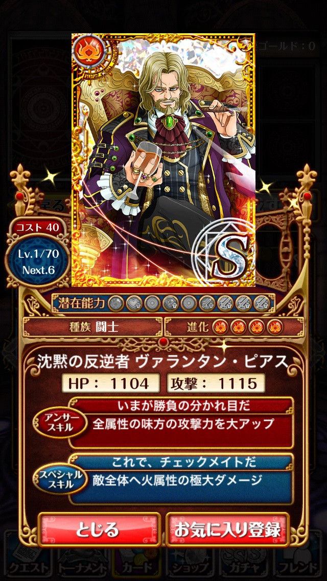【ウィズ】沈黙の反逆者ヴァランタン・ピアス ステータス・潜在能力など 複色デッキに入れたい 2014年05月22日 カテゴリ:話題・グッズ等 582: 名無しさん@お腹いっぱい。:2014/05/21(水) 03:39:43.80 ID:1rSgOdMo Aタヌキ引けたー! ヴァランタンS出来たー! 初期ステータス http://imgur.com/abr7rHu