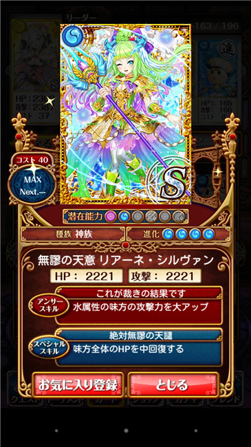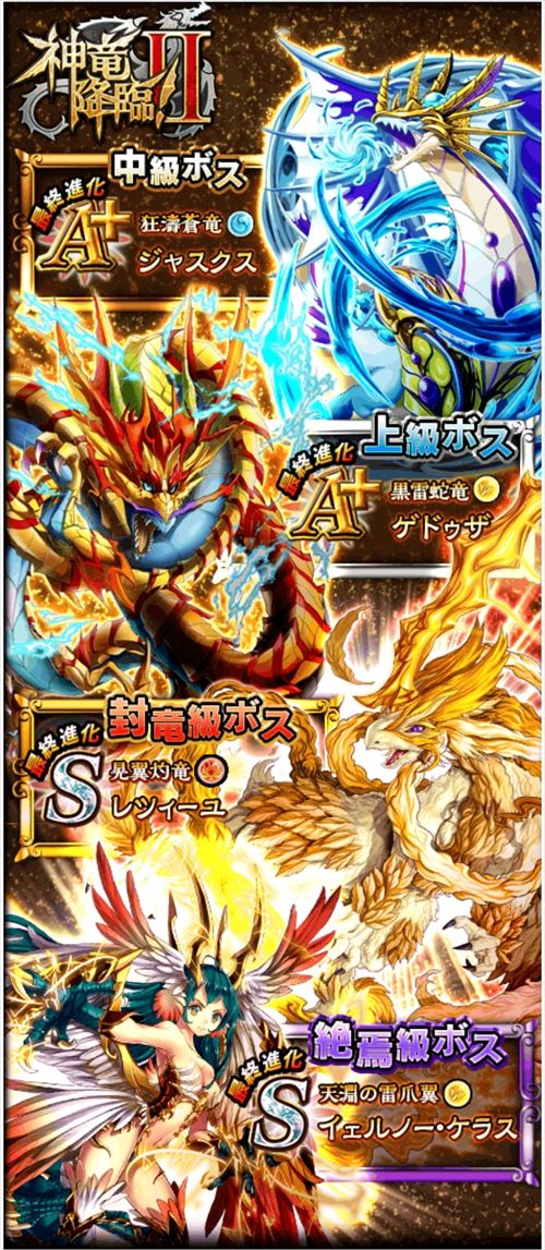 【ウィズ】神竜ガチャに登場する精霊達の最終ステータスまとめ 2014年06月25日 カテゴリ:話題・グッズ等 448: 名無しさん@お腹いっぱい。:2014/06/24(火) 16:59:24.07 ID:Wy6s5Wvm ■神竜ガチャに登場する精霊達の最終ステータス 【 SS】幻朧騎士団長 ゼリィ・ゼリィ MAX攻撃力:2309 MAXHP:2283 AS:火・水属性の味方の攻撃力を大アップ SS:ジャンルパネルをシャッフル 【S】竜学の大賢者 クロエ・マッケンジー MAX攻撃力:2185 MAXHP:2092 AS:水属性の味方の攻撃力を大アップ SS:3ターン敵全体に毒のダメージを与える 【S】燎原の鬼心竜 ザノガラッゾ MAX攻撃力:1677 MAXHP:2000 AS:敵の数に関わらず敵全体へダメージ大アップ SS:敵全体へ火属性の極大ダメージ 【S】黒魔竜の秘義使い ウォルバ・ゾナー MAX攻撃力:2110 MAXHP:1732 AS:3問連続正解でダメージアップ SS:敵全体のHPを15%減少させる 【S】虚空に棲まう魔神竜 ヴシュトナーザ MAX攻撃力:2221 MAXHP:1821 AS:7問連続正解で敵単体へのダメージ超絶アップ SS:敵全体へ雷属性の極大ダメージ 【S】黒竜甲の剛武人 バス・ラシュール MAX攻撃力:2104 MAXHP:2009 AS:イチかバチかで敵単体にダメージ絶大アップ SS:火属性の味方の攻撃力を大アップ 【S】火天竜武君 ワン・シャンユン MAX攻撃力:3001 MAXHP:1003 AS:敵単体を2回連続攻撃 SS:ジャンルパネルをシャッフル 【S】凄麗なる竜の手の スーチャ・ヨゥン MAX攻撃力:2121 MAXHP:2003 AS:残りHPが80%以上でダメージ大UP SS:ジャンルパネルを水属性化 【S】電光竜穿槍 パメラ・ホーク MAX攻撃力:1921 MAXHP:2365 AS:戦闘不能の仲間の数だけ攻撃力大アップ SS:自分を犠牲に全員をHP50%蘇生 【A+】雷角飛竜 ブリッツホーンドラゴン MAX攻撃力:1431 MAXHP:1531 AS:敵の数に関わらず敵全体へダメージ大アップ SS:敵全体へ雷属性の大ダメージ 【A+】茸竜 グレートファンガスドラゴン MAX攻撃力:1778 MAXHP:1682 AS:水属性の味方のHPをかなり回復 SS:4ターン味方全体を徐々に回復する 【B+】溶岩竜 ラーヴァドラゴン MAX攻撃力:1557 MAXHP:1443 AS:火属性の味方の攻撃力を大アップ SS:雷属性ダメージを50%軽減 【B+】吹雪の竜カブキ キヨナギマル・ムツ MAX攻撃力:1766 MAXHP:1478 AS:火属性の敵単体へ絶大ダメージ SS:ジャンルパネルを水属性化 【B+】お目覚めラッパ隊 ハリエット・ネル MAX攻撃力:1554 MAXHP:1555 AS:火属性の味方のHPをかなり回復 SS:火属性の味方の攻撃力を大アップ