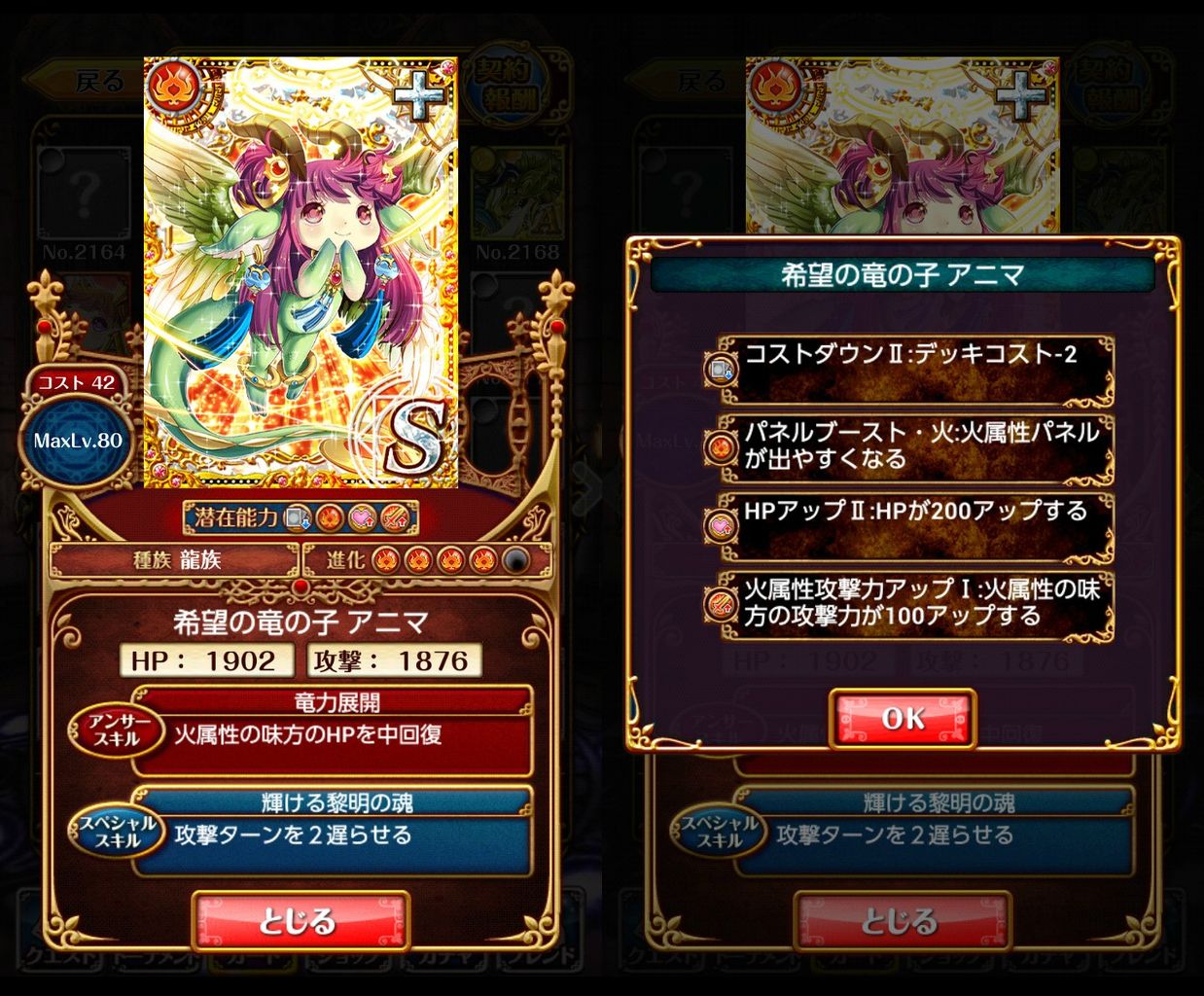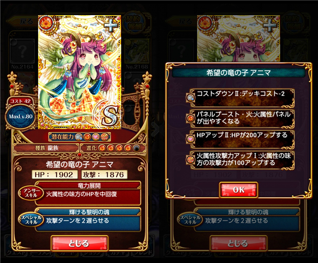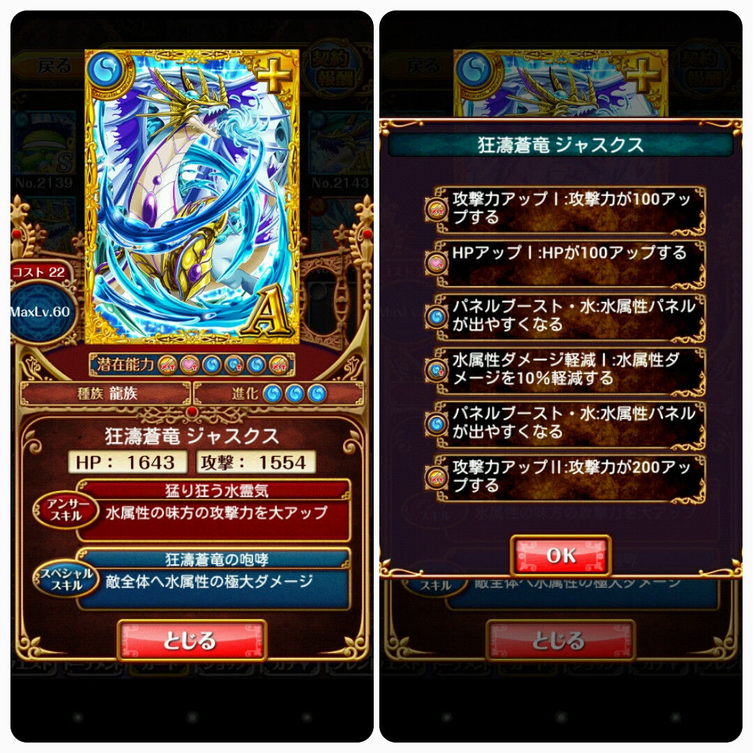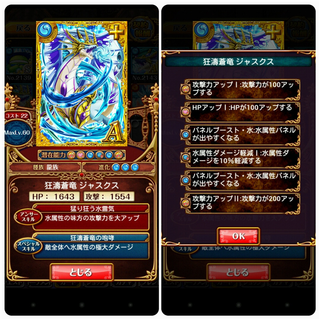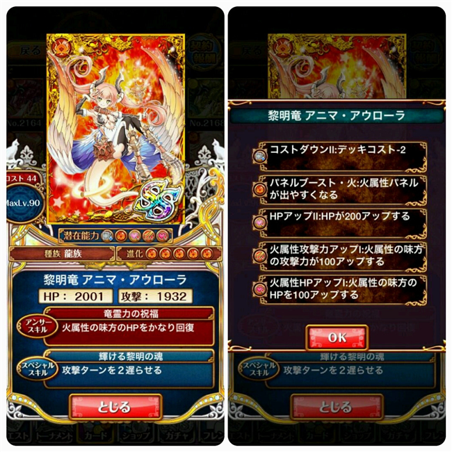 【ウィズ】アニマ・アウローラ、ジャスクス、ゲドゥザ、レツィーユ 、イェルノー・ケラス、ナフィーヤ・ロドム ステータス・潜在能力まとめ 2014年06月26日 カテゴリ:話題・グッズ等 4: 名無しさん@お腹いっぱい。:2014/06/25(水) 15:02:30.69 ID:HjdhwZzC 本スレより転載 【初級】 【SS】黎明竜 アニマ・アウローラ MAX攻撃力:1932 MAXHP:2001 AS:火属性の味方のHPをかなり回復(9%) SS:攻撃ターンを2遅らせる 【中級】 【A+】狂濤蒼竜 ジャスクス MAX攻撃力:1554 MAXHP:1643 AS:水属性の味方の攻撃力を大UP SS:敵全体へ水属性の極大ダメージ