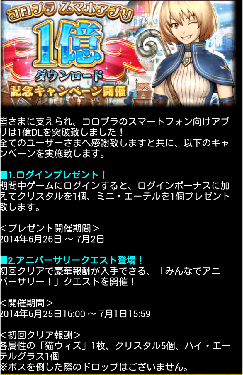 【ウィズ】1億ダウンロード記念のクエスト登場!各色猫ウィズ、クリスタル5個、ハイエーテル1 2014年06月25日 カテゴリ:話題・グッズ等 969: 名無しさん@お腹いっぱい。:2014/06/25(水) 16:00:56.48 ID:qdL0+Y2j アニバーサリーか 972: 名無しさん@お腹いっぱい。:2014/06/25(水) 16:04:11.92 ID:CY1d6ajW 栗は5個か 973: 名無しさん@お腹いっぱい。:2014/06/25(水) 16:04:17.28 ID:M+m/e9B2 猫ウィズ各色1つずつ ハイエーテル1つ クリ5個 猫ウィズは経験値64707