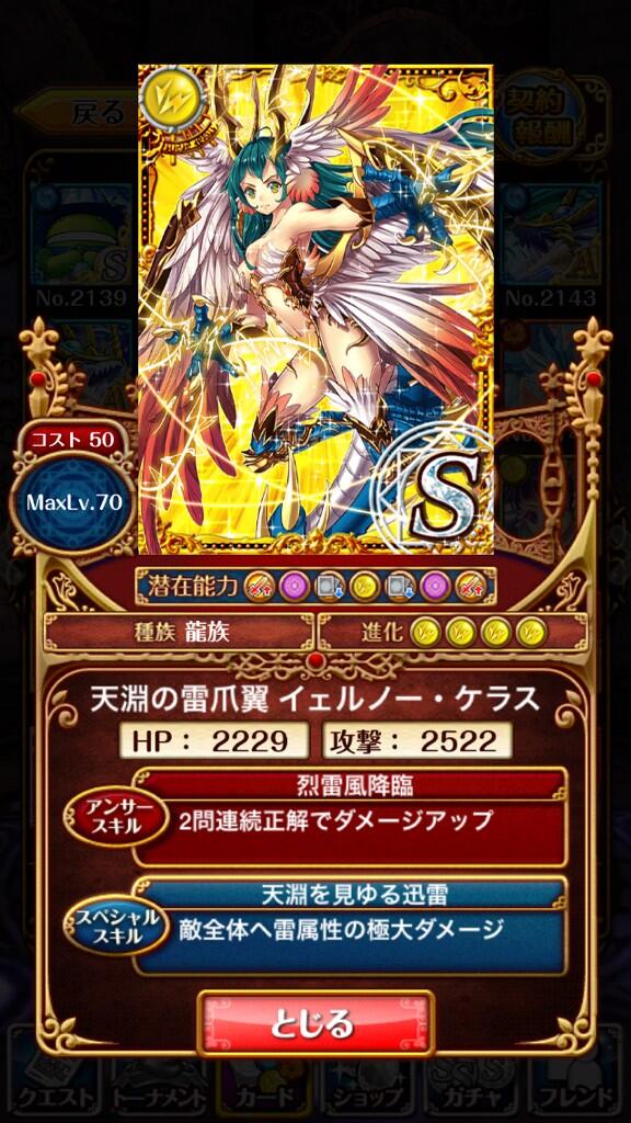 【ウィズ】絶焉級の道中で「秘されし竜霊神ナフィーヤ・ロドム」ドロップしたんだが ステ・潜在 2014年06月24日 カテゴリ:話題・グッズ等 378: 名無しさん@お腹いっぱい。:2014/06/24(火) 05:06:47.30 ID:Xd336sOw 龍の絶級の道中で見慣れないSSが出てきてドロップしたんだが 「秘されし竜霊神ナフィーヤ・ロドム」って、何ぞこれ??? 380: 名無しさん@お腹いっぱい。:2014/06/24(火) 05:07:53.33 ID:qa7VnFF+ >>378 メル似のあれか? 382: 名無しさん@お腹いっぱい。:2014/06/24(火) 05:09:05.60 ID:JI5qIIBM >>378 うp 新しい火種また出てきたのか 383: 名無しさん@お腹いっぱい。:2014/06/24(火) 05:09:29.42 ID:Xd336sOw しかも最初からSSで進化無し ちょっと今魔道書回してるからうp待ってくれw 384: 名無しさん@お腹いっぱい。:2014/06/24(火) 05:09:49.79 ID:qa7VnFF+ つかまぁ、これ?