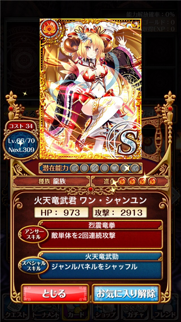 【ウィズ】5段特化キャラ?火天竜岳君ワン・シャンユン ステータス・潜在能力など 2014年06月24日 カテゴリ:話題・グッズ等 870: 名無しさん@お腹いっぱい。:2014/06/23(月) 21:55:56.51 ID:7bc8Boso 追記:MAXステ HP1003、攻撃3001