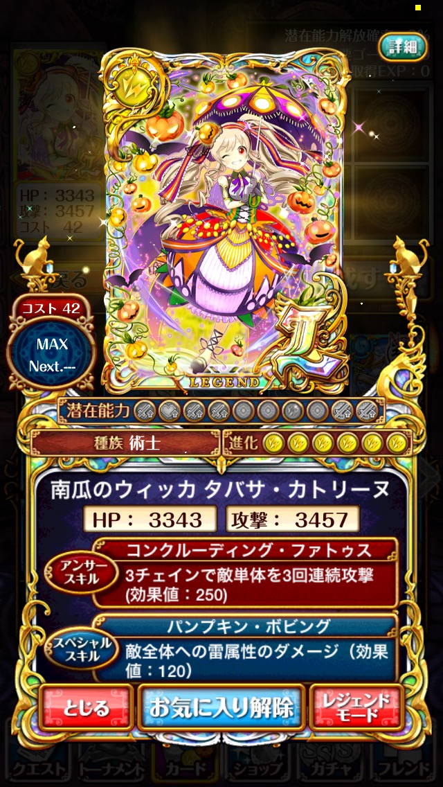 【ウィズ】《既存L進化》南瓜のウィッカ タバサ・カトリーヌ(L) 最終ステータス・潜在能力 2015年11月02日 カテゴリ:話題・グッズ等 450: 名無しさん@お腹いっぱい。 2015/11/02(月) 19:53:31.71 ID:Is4s8+X7.net