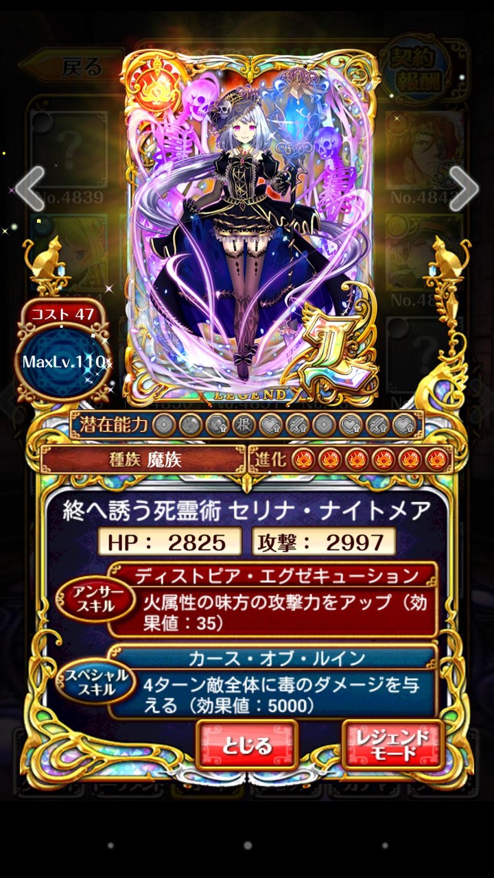 【ウィズ】《既存L進化》終へ誘う死霊術セリナ・ナイトメア(L) 最終ステータス・潜在能力 2015年11月02日 カテゴリ:話題・グッズ等 173: 名無しさん@お腹いっぱい。 2015/11/02(月) 19:24:16.79 ID:zbL8KWzL.netセリナ これクロマグ杯の脇の方が覚醒的に良くね?