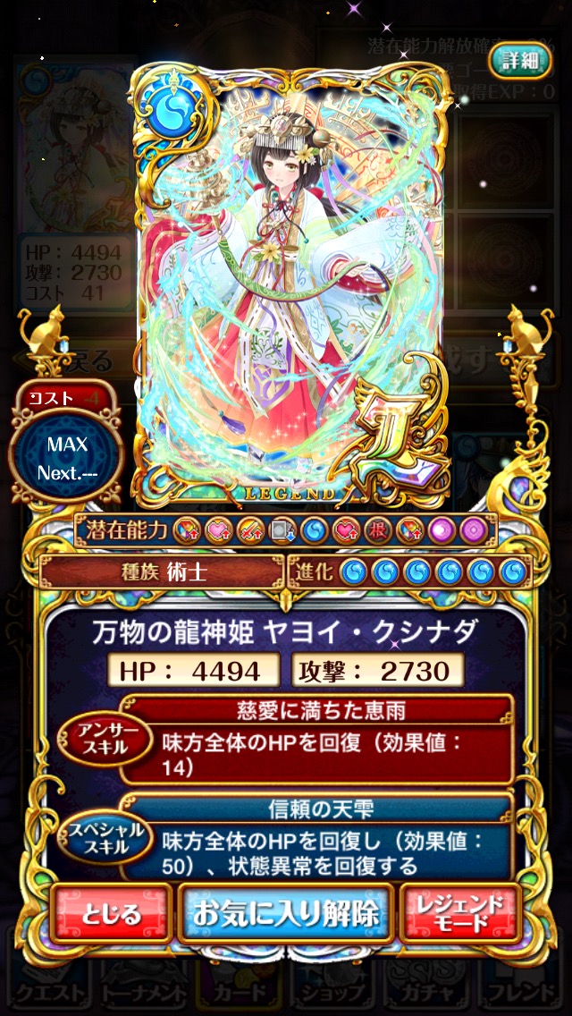 【ウィズ】《既存L進化》万物の龍神姫ヤヨイ・クシナダ(L) 最終ステータス・潜在能力 2015年11月02日 カテゴリ:話題・グッズ等 SS必要正解数:7(4)-9(6)73: 名無しさん@お腹いっぱい。 2015/11/02(月) 19:15:14.28 ID:RhCohL6P.net