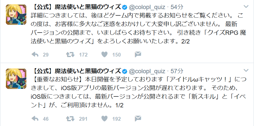 【ウィズ】《悲報…》アイドルωキャッツ、iOS版は最新バージョンが公開されるまで「新スキル」と「イベント」が利用できず→リリース完了 2017年05月31日 カテゴリ:話題・グッズ等 468: 名無しさん@お腹いっぱい。 (ワッチョイWW 5f0c-vYM5):2017/05/31(水) 13:22:19.62 ID:5DdsMTKX0.net クソワロタ 【重要なお知らせ】本日開催を予定しております「アイドルωキャッツ!」につきまして、iOS版アプリの最新バージョン公開が遅れております。 そのため、iOS版につきましては、最新バージョンが公開されるまで「新スキル」と「イベント」が、ご利用頂けません。1/2