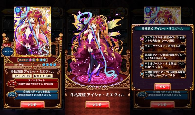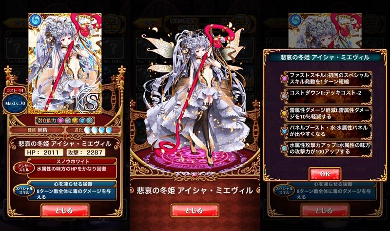 【ウィズ】冬枯凍姫アイシャ・ミエヴィル、悲哀の冬姫アイシャ・ミエヴィル ステータス・潜在能力 2014年03月29日 カテゴリ:話題・グッズ等 アイシャの分岐進化アイシャA~A+冬枯凍姫アイシャ・ミエヴィル(S)アンサースキル:水属性の味方のHPをかなり回復(9%)スペシャルスキル:敵全体のHPを15%減少させる(9T)悲哀の冬姫アイシャ・ミエヴィル(S)アンサースキル:水属性の味方のHPをかなり回復(9%)スペシャルスキル:8ターン敵全体に毒のダメージ(800)を与える(7T発動)画像はTwitterのmiku39さんから 「話題・グッズ等」カテゴリの最新記事 人気記事ランキング コメント コメントする コメントフォーム 名前 コメント 評価する リセット リセット 顔 星 投稿する 情報を記憶
