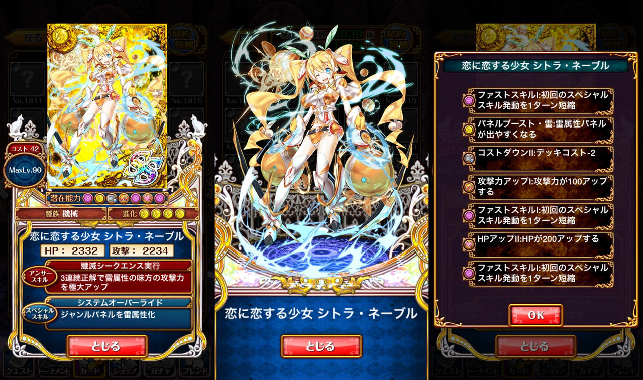 【ウィズ】恋に恋する少女シトラ・ネーブル ステータス・潜在能力など 全覚醒でパネル変換3T発動! 2014年04月30日 カテゴリ:話題・グッズ等 @miku39wiz: miku39 2014-04-30 21:32恋に恋する少女 シトラ・ネーブル AS 攻+40% SS 6ターン発動 i.imgur.com/QEqgbaW.jpg pic.twitter.com/2FUejU8qgu 返信 リツイ お気に@matuuuuuuu: まつろー 2014-04-30 21:36シトラとソラナ明らかにつええ・・・ 返信 リツイ お気に@aimohumohu: ふもっふ@もふもふ 2014-04-30 21:43シトラとソラナが強いのな。まぁもうクリスタルはないんだがな! 返信 リツイ お気に@huta_26: huta 2014-04-30 21:49シトラ、トウマ、イーリン、助っ人マイアさんで水殴ったらどうなるんだろう凄く夢が広がる 返信 リツイ お気に@moco39: もこ 2014-04-30 21:56シトラほしいけど限定カードなんてひけたことないよ! 返信 リツイ お気に@ashizu00: たいらの さわただ 2014-04-30 22:07シトラ欲しいなー。GW中にもう一回10連回しそうだw 返信 リツイ お気に@akatsuki_wiz: アルトリウス 2014-04-30 22:26ウィズの方は盛大にやらかしました。゚(゚^o^゚)゚。クリスタル400個が電異の海に消えました。・゚・(ノД`)・゚・。シトラ欲しかった。 返信 リツイ お気に@zoo_wiz: zoo@黒猫のウィズ 2014-04-30 22:27@akatsuki_wiz 400個も?!うああああ。゚(゚´ω`゚)゚。 返信 リツイ お気に@sng_wiz: しんご@8段 2014-04-30 22:35シトラめっちゃほしい 返信 リツイ お気に@kuro_moshigo: 革命の申し子 2014-04-30 23:10@wiz_ruri 今回のダウンロード記念のシトラが能力的に物凄く欲しい(つд`)てか雷両方とも欲しいヽ(;▽;)ノ 返信 リツイ お気に@kuronekonoflame: フレイム@黒猫のウィズ専用 2014-04-30 23:21シトラに関してはヒカリ(フル覚醒してるし)持ってるからそこまででもないけど、でも居たら6段8段がサクサクいきそうね。 返信 リツイ お気に 「話題・グッズ等」カテゴリの最新記事 人気記事ランキング コメント コメントする コメントフォーム 名前 コメント 評価する リセット リセット 顔 星 投稿する 情報を記憶