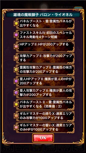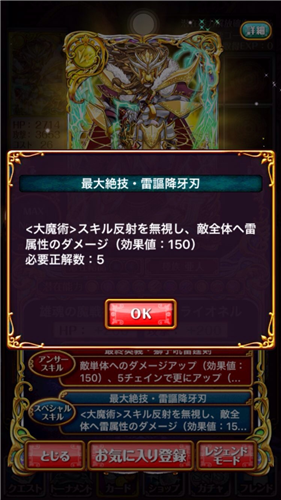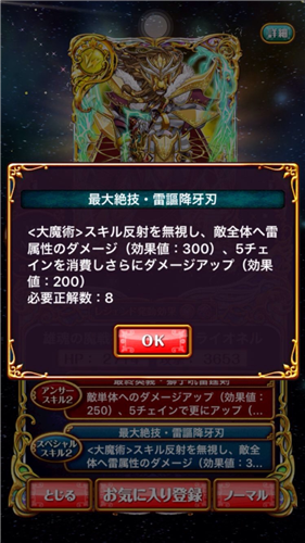 SS2:<大魔術>スキル反射を無視し、敵全体へ雷属性のダメージ(効果値:300)、5チェインを消費しさらにダメージアップ(効果値:200) 【必要正解数:8】