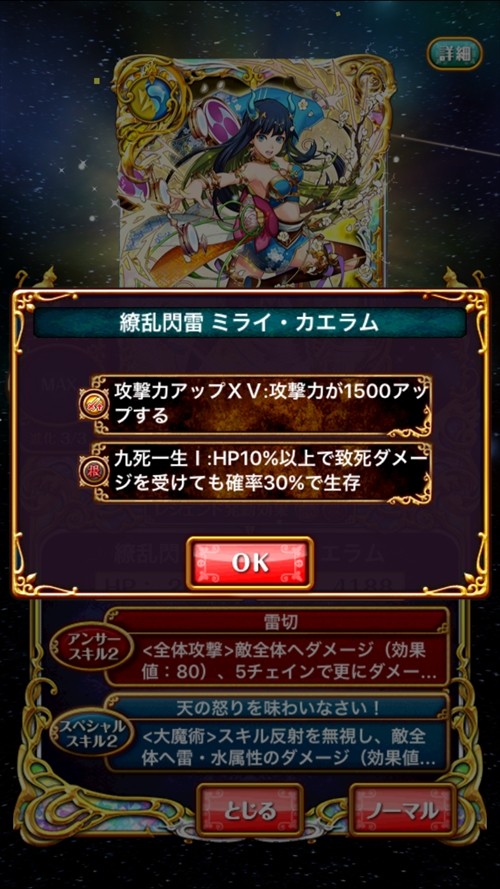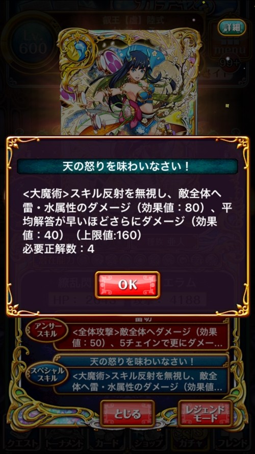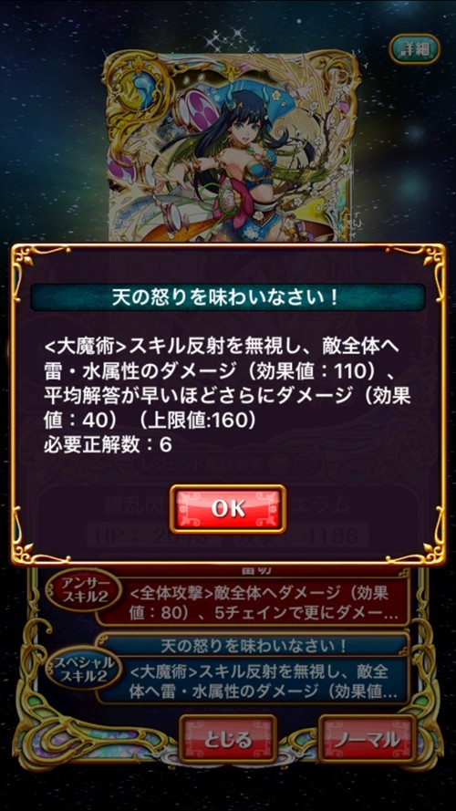SS2(6T):<大魔術>スキル反射を無視し、敵全体へ雷・水属性のダメージ(効果値:110)、平均解答が早いほどさらにダメージ(効果値:40)(上限値:160)
