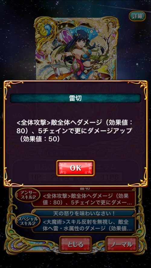 AS2:<全体攻撃>敵全体へダメージ(効果値:80)、5チェインで更にダメージアップ(効果値:50)