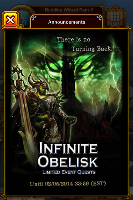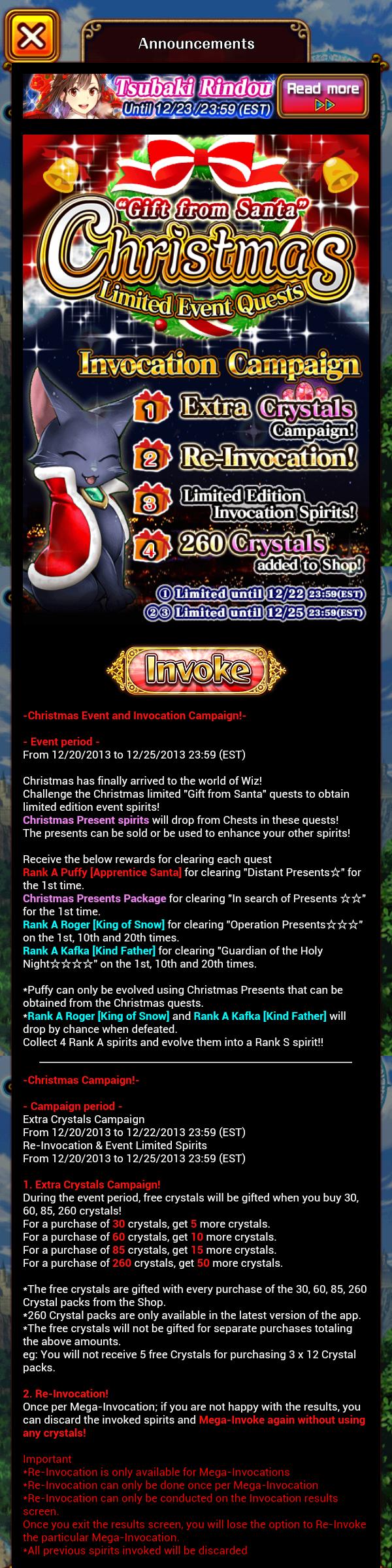 【ウィズ】英語版の新年イベント 無限回廊登場!?単発ガチャも引き直し可能に 2013年12月28日 カテゴリ:海外版 677: 海外版ウォッチャー:2013/12/27(金) 23:06:53.87 ID:CPQtsC/f 盛り上がってるところ悪いけど、英語版の新年イベントもキテるで。 ・無限回廊登場 「限定クエストにチャレンジして、"あの有名魔導士"のカードを手に入れよう!伐採あり。コンテ不可」 有名魔導士…猫ウィズですかね? ・単発ガチャも引き直し可能に