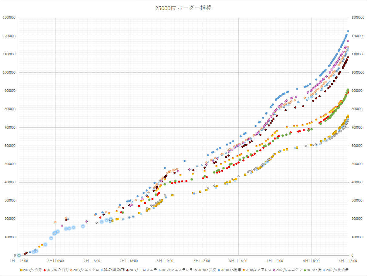 【ウィズ】《大魔道杯in桃娘伝》2日目12時時点、総合25000位ボーダー推移! 2018年08月25日 カテゴリ:話題・グッズ等 988: 名無しですよ、名無し!(チベット自治区) (ワッチョイ 6a7c-PcWx) 2018/08/25(土) 12:47:21.19 ID:Gkb5vioL0 久々に初日の推移見れたので一応置いとく